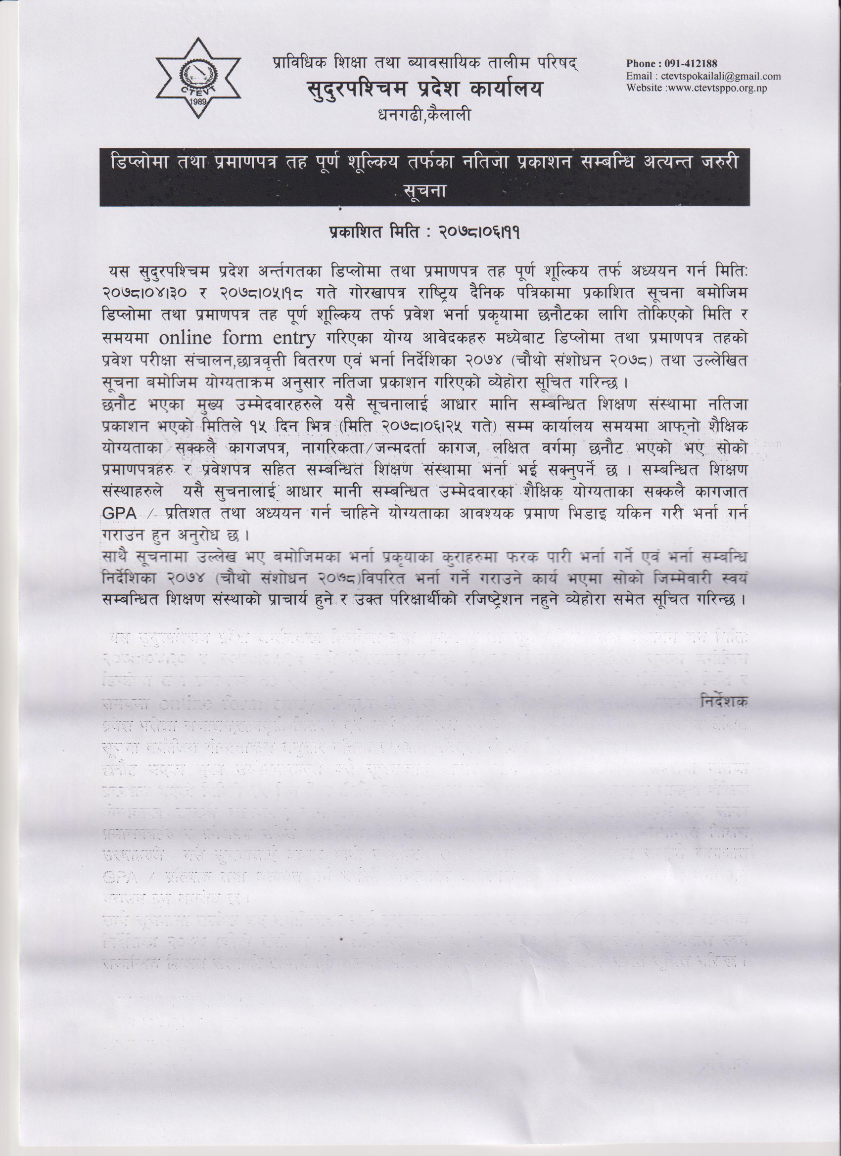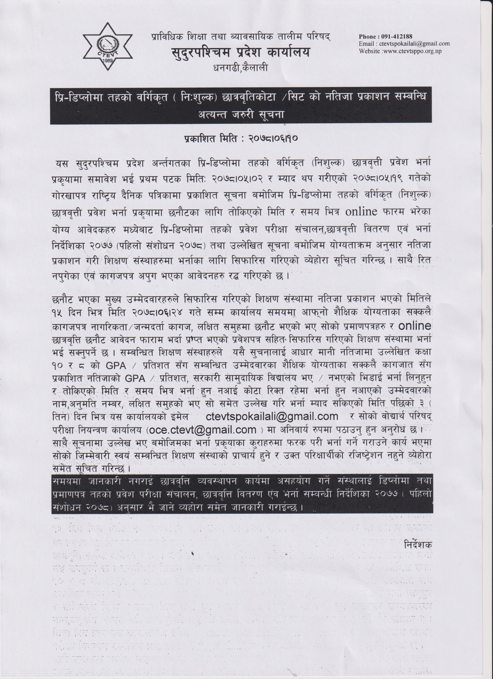 Result of Special Scholarship Program 1st, 2nd & 3rd Year (Engineering, Agriculture, Hotel, Food, Ent. Dev.) exam held on 2077 Mansir